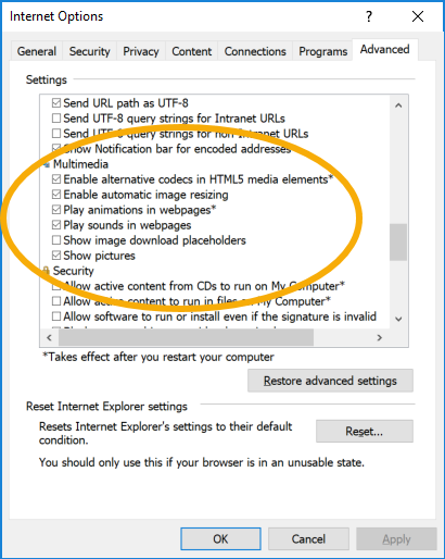 If users are able to watch a video, but there is no sound, it’s important to determine whether the problem is specific to QuickHelp, or is a more widespread problem.  If the problem is not specific to QuickHelp, there is a good chance that the audio has been turned off in the browser settings. In IE, this is enabled by opening Internet Options > Advanced > Multimedia > Play sounds in webpages.